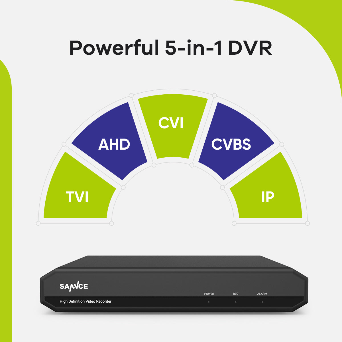 The hybrid digital video recorder works with TVI, AHD, CVI, CVBS analog and IP security cameras (up to 1080p Full HD resolution). You may add any type of security camera you want to this DVR for 24/7 recording.