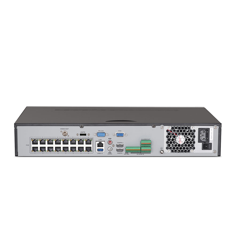 The NVR supports up to 32pcs ONVIF cameras (16 cameras connected to 16 PoE ports directly & another 16 cameras need a PoE injector - not included), which is compatible with 1MP, 2MP, 3MP, 4MP, 5MP, 6MP, 7MP, 8MP (4K) & 12MP IP cameras for unrivaled integration.
